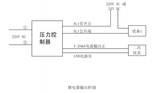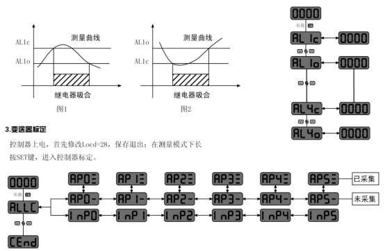例:要設(shè)定開關(guān)點(diǎn)1為上線報(bào)警輸出(常開功能)在4.000MPa吸合,小于3.995MPa斷開,開關(guān)點(diǎn)為2下限報(bào)警輸出(常閉功能)在1.000MPa斷開,低于0.995MPa吸合進(jìn)入菜單:設(shè)定AL1c=4000 AL1o=3995