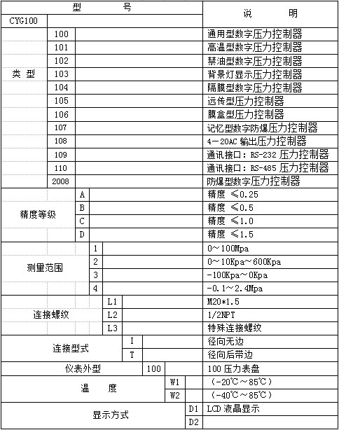 智能數(shù)字壓力控制器選型表: